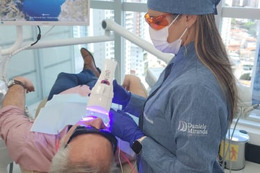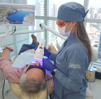 O Clareamento Dental é um procedimento seguro onde utilizamos agentes clareadores que removem manchas, deixando os dentes mais brancos e brilhantes. Além disso, algumas tecnologias, como a luz violeta, podem ser utilizadas para potencializar os resultados do clareamento de maneira segura e eficaz.